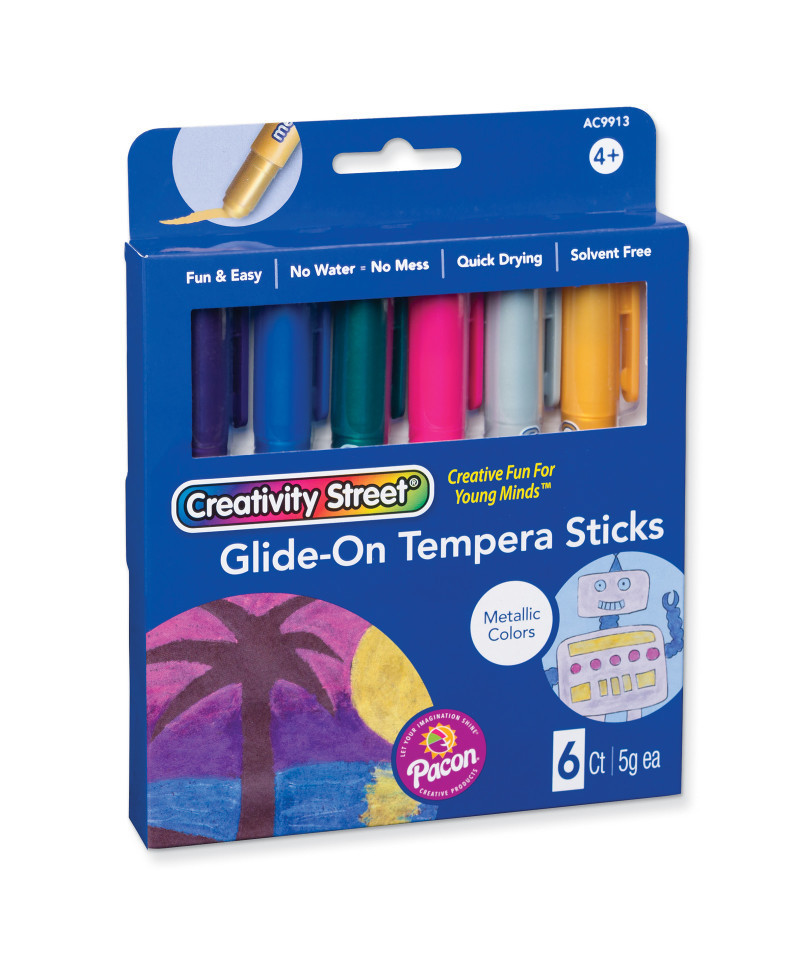 Our Creativity Street® Glide-On Tempera Paint Sticks are fun and easy to use to create beautiful works of art. They glide on surfaces such as paper, chipboard, plastic, and much more. These sticks do not bleed through, wrinkle or tear paper. The Metallic color assortment includes six colors: Metallic Pink, Metallic Green, Metallic Blue, Metallic Purple, Metallic Silver and Metallic Gold. Each stick is 5 grams. The wide barrels are easy for little hands to control. Twist the bottom of the barrel to push up more paint. Paint directly onto the art surface, or use with a paint brush by adding a little water in a paint pallet or tray.