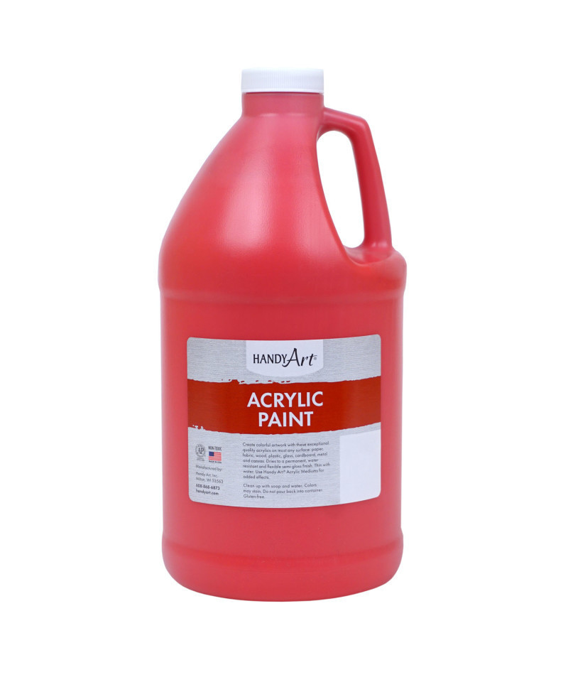 Handy Art® acrylic paints combine high quality with low cost and are the preferred choice for paint parties! You can explore most any idea or project with this economical spectrum of colors. Use on most any surface: paper, fabric, wood, plastic, glass, cardboard, metal and canvas. Rich and durable colors dry to a permanent, water resistant and flexible semi-gloss finish. Clean up with soap and water. Certified AP Non-Toxic and Gluten-Free. Made in the USA. Each bottle is 64 oz.
