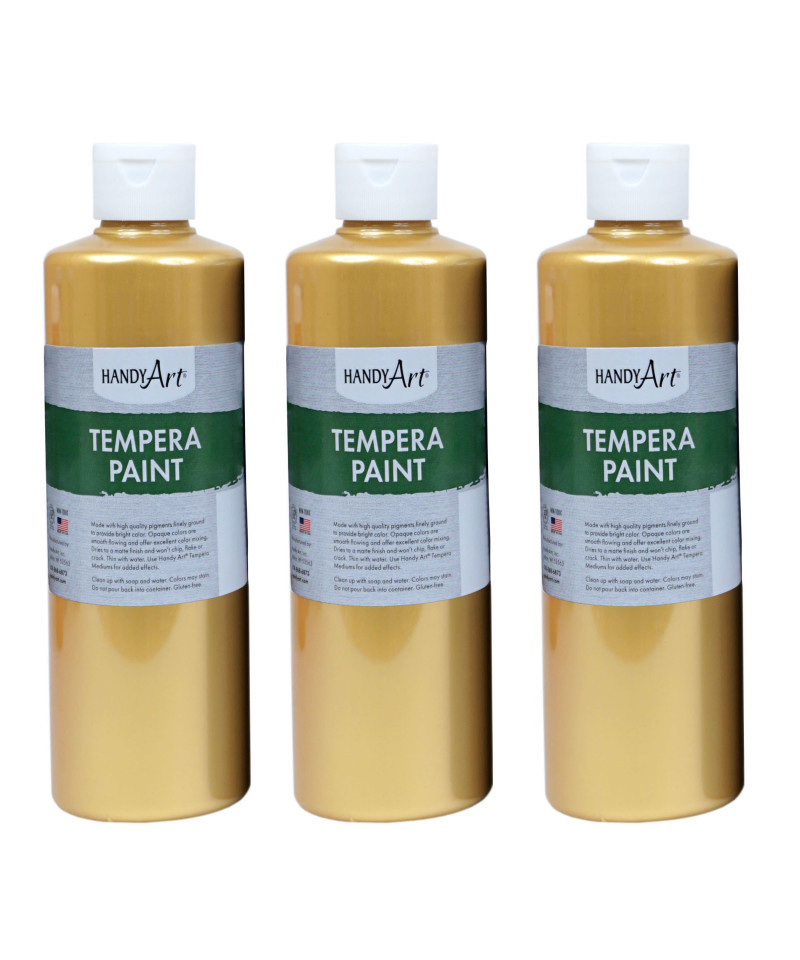 Metallic Tempera Paint offers excellent opacity and coverage and adds a lustrous gleam on art, craft and school projects! These creamy temperas can be used on surfaces such as paper, poster board, cardboard, wood and papier-mâché. Paint dries to a matte finish and won't chip, flake or crack when dry. Paint is non-toxic and water based and cleans up easily with soap and water. Made in the USA. Certified AP Non-Toxic. Each bottle is 16 oz. Sold as a pack of 3 bottles.