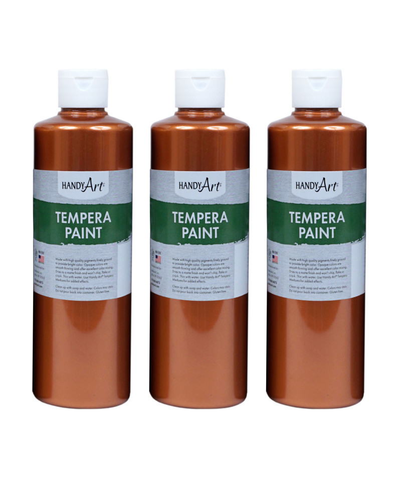 Metallic Tempera Paint offers excellent opacity and coverage and adds a lustrous gleam on art, craft and school projects! These creamy temperas can be used on surfaces such as paper, poster board, cardboard, wood and papier-mâché. Paint dries to a matte finish and won't chip, flake or crack when dry. Paint is non-toxic and water based and cleans up easily with soap and water. Made in the USA. Certified AP Non-Toxic. Each bottle is 16 oz. Sold as a pack of 3 bottles.