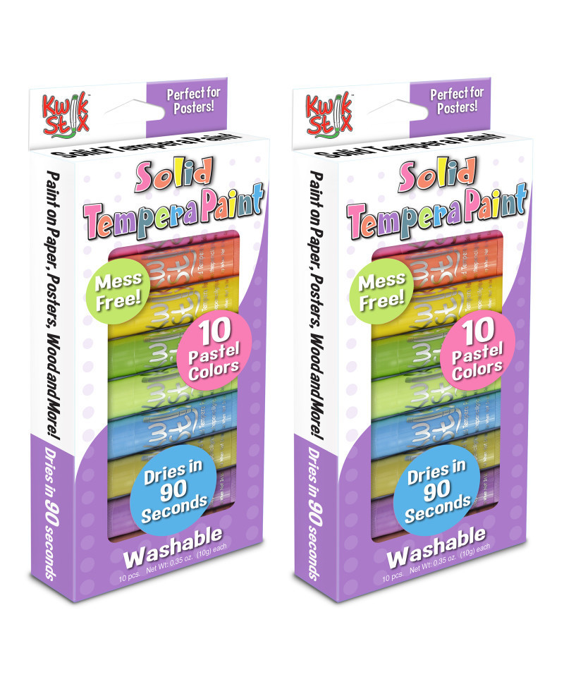 Tired of the endless mess of painting? Fear not! Kwik Stix Solid Tempera Paint sticks take the mess out of painting while keeping all the fun! Simply uncap, twist, and paint! Kwik Stix have a fast drying formula that allow them to dry in 90 seconds while still leaving a paint-like finish! No cups, smocks, water or brushes required. Kwik Stix come in assorted vibrant colors with coverage that won't crack. Great on poster paper, cardboard, wood, canvas, glass and more. Each pack includes 10 paint sticks. Sold as 2 packs for a total of 20 paint sticks.
