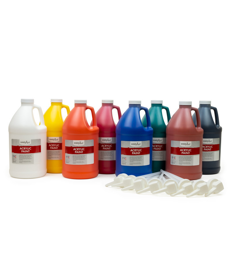 Handy Art® Student Acrylic is a high quality, economical classroom acrylic. This full spectrum of brilliant colors dry to a permanent, water resistant and flexible semi-gloss finish. Can be used on most any surface: paper, fabric, wood, plastic, glass, cardboard, metal and canvas. Water based and AP Certified non-toxic. Made in USA. Includes 8 jugs of paint and 8 paint pumps. Colors include Titanium White, Chrome Yellow, Chrome Orange, Brite Red, Phthalo Blue, Phthalo Green, Burnt Sienna and Mars Black.