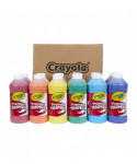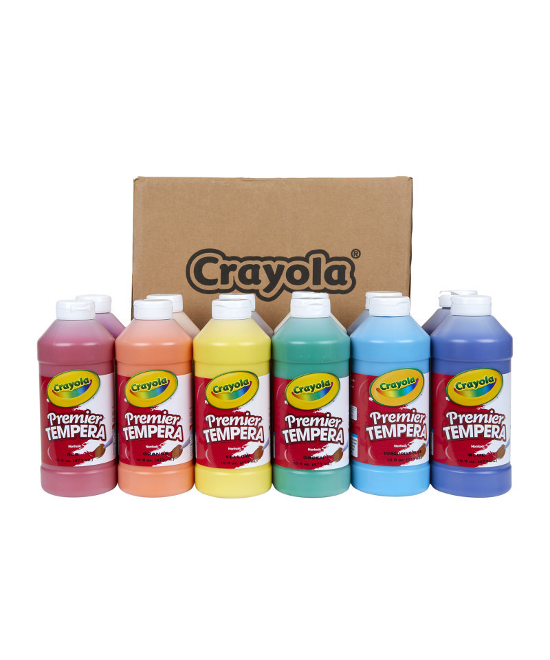 Get started on your next DIY craft with Crayola Tempera Paint. Premier Tempera provides rich consistency, ultimate opacity, superior secondary color mixing, and brilliant colors to match a child's vivid imagination. Its creamy consistency provides a smooth laydown and brush flow. One coat coverage allows for excellent performance on a variety of surfaces including newspaper, cardboard, and papier-mâché. It will not chip, flake, "powder" or bleed through when dry, and does not separate. It comes in a freeze-thaw stable formula with a plastic squeeze bottle featuring an air-tight flip-top lid. Each set includes (12) 16 oz. bottles of Premier Tempera Paint in assorted colors: black, blue, brown, green, magenta, orange, red, turquoise, violet, white, yellow and peach.