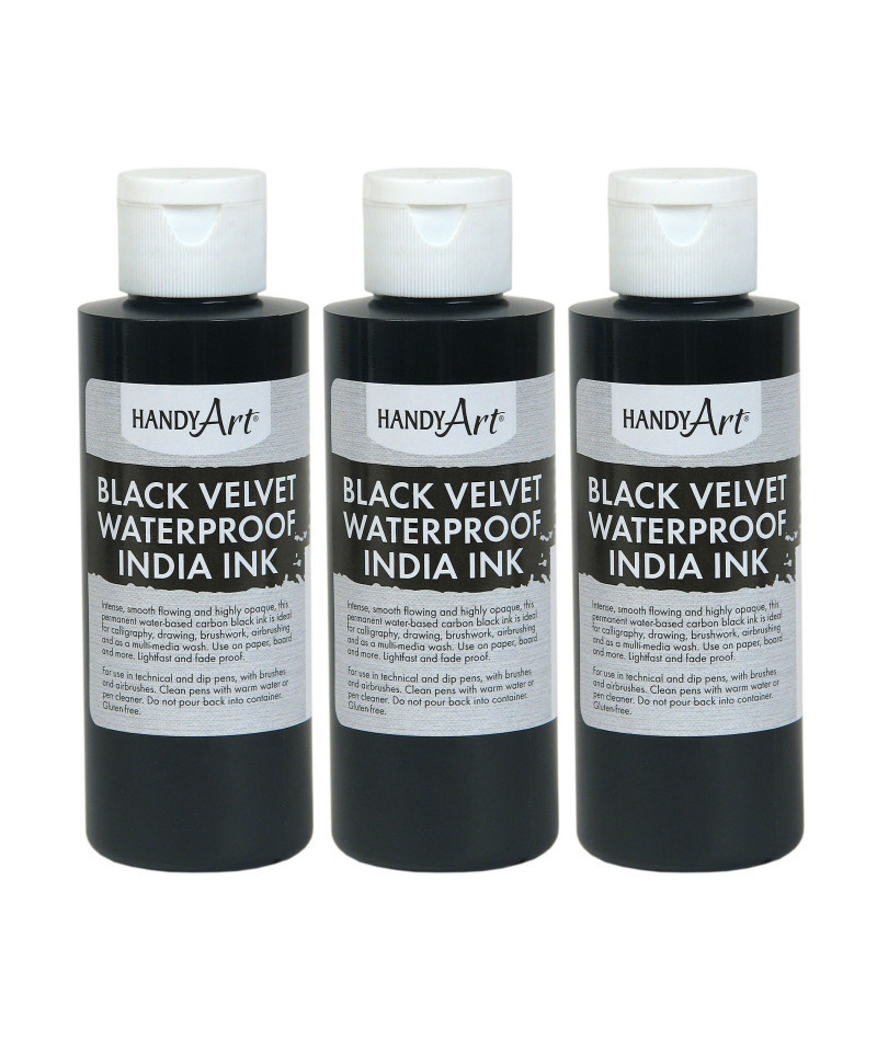 Rich, smooth flowing and highly opaque, this permanent carbon black ink is ideal for calligraphy, drawing, brushwork, airbrushing and as a multimedia wash. For use with technical pens, dip pens, brushes and airbrushes. Lightfast and fade proof. Water based and Certified AP Non-Toxic. Made in the USA. Each bottle includes 4 oz. Sold as a pack of 3 bottles.