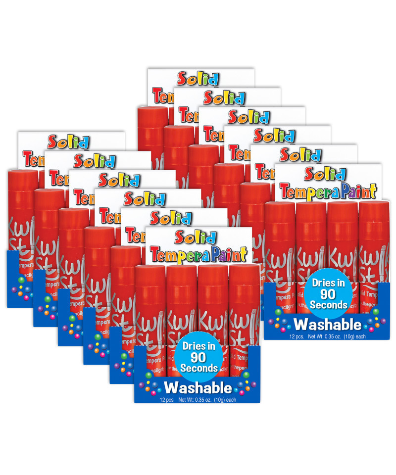 Single color Kwik Stix pack, great for projects needing certain colors replaced quicker than others. Box includes 12 Red Kwik Stix. No cups, smocks, water or brushes needed. Great on poster paper, cardboard, wood and canvas - and MORE! These washable paints are non-toxic and nut, egg and gluten free. Simply uncap, twist and paint!