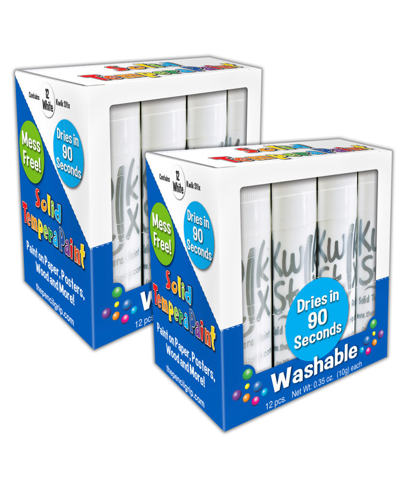 Single color Kwik Stix pack, great for projects needing certain colors replaced quicker than others. No cups, smocks, water or brushes needed. Great on poster paper, cardboard, wood and canvas - and MORE! These washable paints are non-toxic and nut, egg and gluten free. Simply uncap, twist and paint! Each box includes 12 White Kwik Stix. Sold as 2 packs for a total of 24 Kwik Stix.