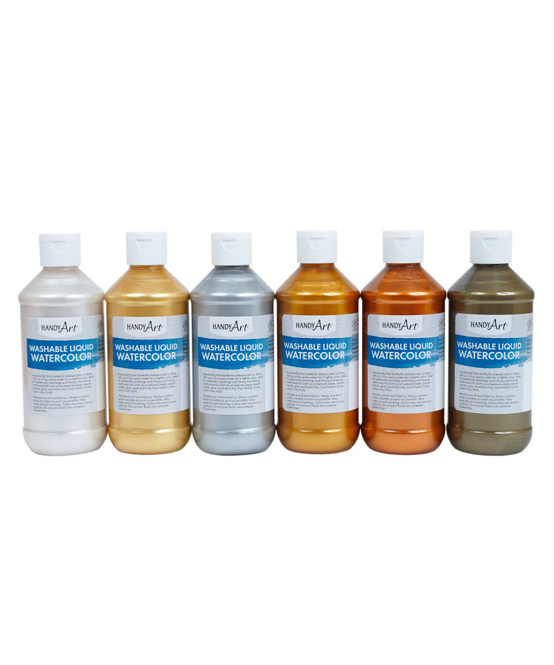 These concentrated liquid dyes can be used directly from the bottle or diluted with up to four parts water to achieve a lighter color. Ideal for watercolor paintings and tinting and dyeing craft materials such as scrapbook paper, papier-mâché, glue, sand and clay. Dye based, some colors may fade. Washes out of most fabrics with soap and hot water. Water based and Certified AP Non-Toxic. Each set includes 6 bottles, 8 oz each.