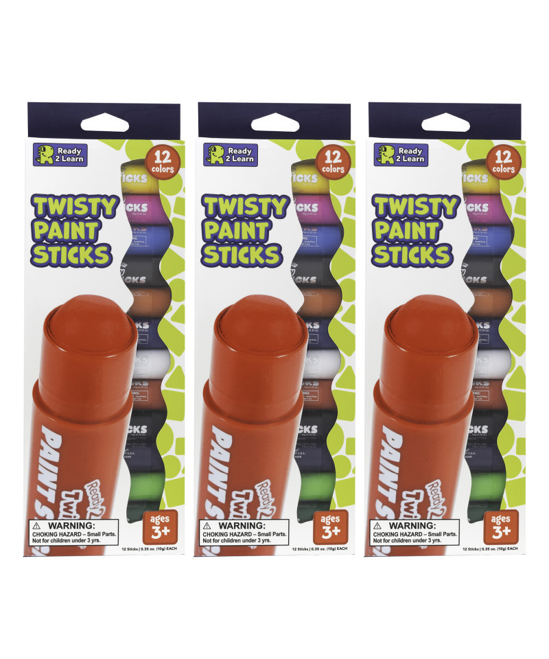 Give youngsters a smooth, mess-free introduction to painting! This set of silky-smooth, quick-drying paint sticks features 12 vibrant colors. There's no need for cleaning brushes or adding water. Offer children a more refined tip than brushes of a similar size. Work with paint while maintaining the creative control of a large crayon or marker. The compact tubes are perfect for little hands to hold. Paint on paper, windows, rocks, wood and more. Simply uncap, twist and create. Each stick twists up and down for easy use, cleanup and storage. Wash paint off of skin, clothes and other surfaces with ease. These colorful paint sticks are ideal for school projects, DIY crafts, window art and more. Includes: 12 colored paint sticks. For ages 3+. Size of each paint stick: 3.5"L x 0.75"W. Sold as 3 packs, with 12 per pack.