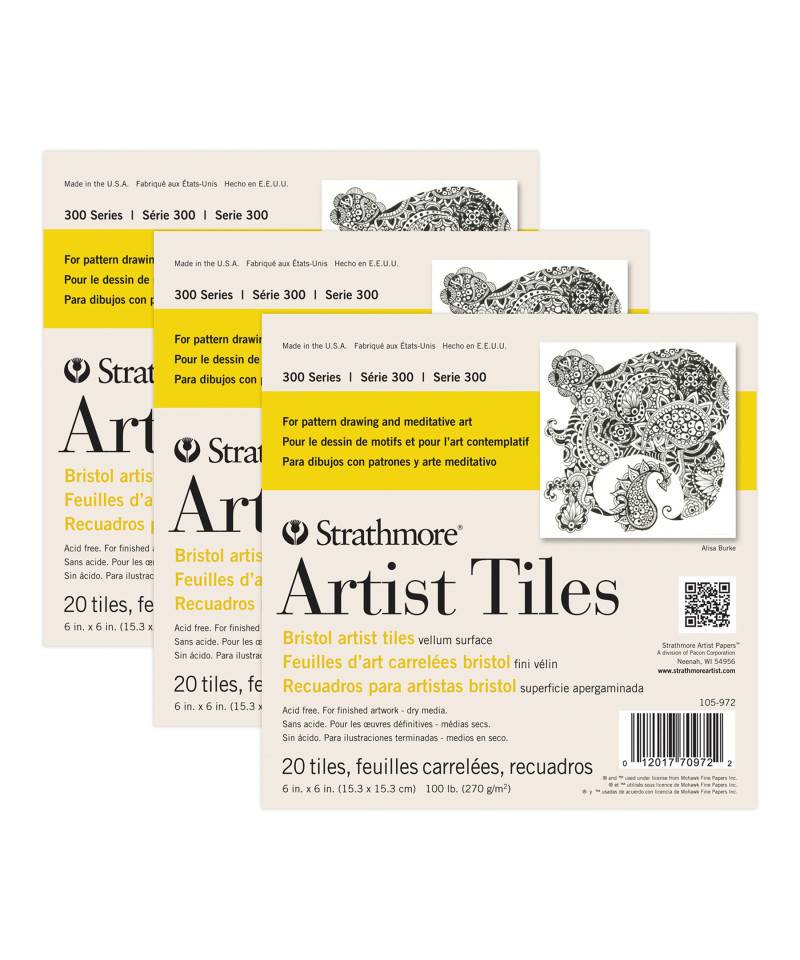 Experience the emotional benefits of art through pattern drawing on Strathmore Artist Tiles. Perfect for enjoying the creative, approachable process of combining repetitive marks, circles, lines, & forms to create small pieces of art. Available in pre-cut, convenient sizes, & appropriate paper surfaces. The history of Strathmore Paper Company began on St. Patrick's Day in 1892 when its founder, Horace Moses, opened the Mittineague Paper Mill in West Springfield, MA. Strathmore has been a leading supplier of fine art papers for 130 years & founded with the belief that better paper makes better art. Strathmore provides artists of all levels with one of the widest ranges of quality surfaces for producing beautiful works of art, no matter the choice of medium. Listening to the needs of artists & providing inspiration, education, & innovating new products is at the core of what matters to Strathmore. The Strathmore 300 Series provides art students & intermediate hobbyists a range of better quality paper for quick studies, technical practice & final pieces in art class or at home. Including a wide variety of surface types, artists working with watercolor paint, acrylic paint, oil paint, pastel, colored pencil, charcoal, marker, pen, ink & more have a curated pad customized for their needs. Trusted by art teachers & affordable for parents & students, the 300 Series is the best way to help build confidence in intermediate artists! Each pack includes 20 sheets. Sold as 3 packs for a total of 60 sheets.