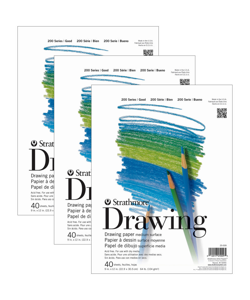 Drawing paper for art class, craft nights & home school! Teach your kids & teens how to expand their drawing skills with a lightweight, fine toothed, white surface made specifically for pencil, colored pencil, charcoal & sketching stick. Explore the next level of the creative process with imaginative projects, navigating portrait & illustrative techniques, capturing on-location cityscapes & practicing accurate proportions & perspectives. The history of Strathmore Paper Company began on St. Patrick's Day in 1892 when its founder, Horace Moses, opened the Mittineague Paper Mill in West Springfield, MA. Strathmore has been a leading supplier of fine art papers for 130 years & founded with the belief that better paper makes better art. Strathmore provides artists of all levels with one of the widest ranges of quality surfaces for producing beautiful works of art, no matter the choice of medium. Listening to the needs of artists & providing inspiration, education, & innovating new products is at the core of what matters to Strathmore. The Strathmore 200 Series provides art students & intermediate hobbyists a range of good quality paper for quick studies, technical practice & final pieces in art class or at home. Including a wide variety of surface types, artists working with watercolor paint, acrylic paint, oil paint, pastel, colored pencil, charcoal, marker, pen, ink & more have a curated pad customized for their needs. Trusted by art teachers & affordable for parents & students, the 200 Series is the best way to help build confidence in novice artists! Sold as a pack of 3.
