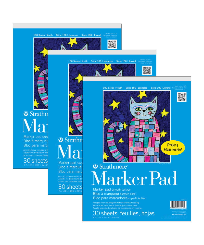 Marker paper for art class, daycare, craft nights & home school! Teach your kids the basics of drawing with a smooth, white paper made specifically for felt-tip markers—paper prevents bleeding & feathering so marker lines are crisp & clean. Explore the creative process with imaginative projects, investigate how a child sees the world around them & lay the ground work of shapes, light & shadow, color, outlines & proportions. The history of Strathmore Paper Company began on St. Patrick's Day in 1892 when its founder, Horace Moses, opened the Mittineague Paper Mill in West Springfield, MA. Strathmore has been a leading supplier of fine art papers for 130 years & founded with the belief that better paper makes better art. Strathmore provides artists of all levels with one of the widest ranges of quality surfaces for producing beautiful works of art, no matter the choice of medium. Listening to the needs of artists & providing inspiration, education, & innovating new products is at the core of what matters to Strathmore. Strathmore Paper Made for Kids! The 100 Series was created to nurture talent & ignite a lifelong love of art by providing artist quality materials at a young age. Designed for ages 5 & up, the paper types & features have been selected to enhance the creative process. Inspirational project ideas are included on the inside front cover of specially marked items. Sold as a pack of 3.