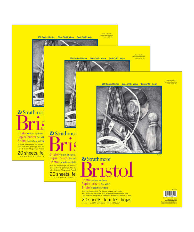Bristol generally describes a heavyweight drawing paper. Bristol sheets provide a stiff, strong surface to work on without the need for mounting. The term Bristol derives from the early days of European papermaking when mills would send their finest papers to Bristol, England to be pasted together to form heavyweight drawing sheets. Our 300 Series Bristol paper is a popular choice among many artists because of the quality paper at a very reasonable price. It comes in a number of pad sizes, loose sheets, & large rolls. It is a 'bristol weight' at 100lb. (270gsm), & is perfect for finished art. Look for it in smooth & vellum surfaces. The history of Strathmore Paper Company began on St. Patrick's Day in 1892 when its founder, Horace Moses, opened the Mittineague Paper Mill in West Springfield, MA. Strathmore has been a leading supplier of fine art papers for 130 years & founded with the belief that better paper makes better art. Strathmore provides artists of all levels with one of the widest ranges of quality surfaces for producing beautiful works of art, no matter the choice of medium. Listening to the needs of artists & providing inspiration, education, & innovating new products is at the core of what matters to Strathmore. The Strathmore 300 Series provides art students & intermediate hobbyists a range of better quality paper for quick studies, technical practice & final pieces in art class or at home. Including a wide variety of surface types, artists working with watercolor paint, acrylic paint, oil paint, pastel, colored pencil, charcoal, marker, pen, ink & more have a curated pad customized for their needs. Trusted by art teachers & affordable for parents & students, the 300 Series is the best way to help build confidence in intermediate artists! Sold as a pack of 3.