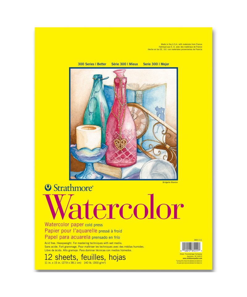The Strathmore 300 Series Watercolor Pad contains a heavyweight, student grade, watercolor paper. Best suited for experimenting & practicing techniques when heavier washes & reworks are required. This paper has two distinct finishes: a popular cold press on top for most watercolor work & on the other side a smooth finish ideal for detail work. The Strathmore 300 Series Watercolor Pad is perfect for water-based media including watercolor, tempera, acrylic, gouache, & poster paint. The history of Strathmore Paper Company began on St. Patrick's Day in 1892 when its founder, Horace Moses, opened the Mittineague Paper Mill in West Springfield, MA. Strathmore has been a leading supplier of fine art papers for 130 years & founded with the belief that better paper makes better art. Strathmore provides artists of all levels with one of the widest ranges of quality surfaces for producing beautiful works of art, no matter the choice of medium. Listening to the needs of artists & providing inspiration, education, & innovating new products is at the core of what matters to Strathmore. The Strathmore 300 Series provides art students & intermediate hobbyists a range of better quality paper for quick studies, technical practice & final pieces in art class or at home. Including a wide variety of surface types, artists working with watercolor paint, acrylic paint, oil paint, pastel, colored pencil, charcoal, marker, pen, ink & more have a curated pad customized for their needs. Trusted by art teachers & affordable for parents & students, the 300 Series is the best way to help build confidence in intermediate artists!
