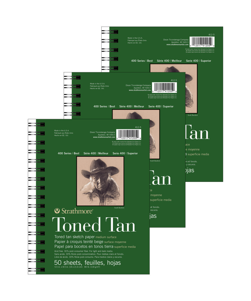 Introducing Strathmore 400 Series Toned Sketch Paper—a professional-level drawing surface made from 100% recycled & 30% post-consumer fiber, as well as kraft & bark fiber inclusions for visual interest. Ideal for light & dark media including graphite, chalk, charcoal, sketching stick, markers, china markers, colored pencils, pens, & white gel pens. The history of Strathmore Paper Company began on St. Patrick's Day in 1892 when its founder, Horace Moses, opened the Mittineague Paper Mill in West Springfield, MA. Strathmore has been a leading supplier of fine art papers for 130 years & founded with the belief that better paper makes better art. Strathmore provides artists of all levels with one of the widest ranges of quality surfaces for producing beautiful works of art, no matter the choice of medium. Listening to the needs of artists & providing inspiration, education, & innovating new products is at the core of what matters to Strathmore. The Strathmore 400 Series, easily recognized by its iconic brown cover, has been a staple in the hands of art students & professional artists. Known for its dependable quality & time-tested durability, this series of art paper provides high school art students, college art students, dedicated hobbyists & career artists a range of surfaces from practice to final pieces. Artists working with watercolor paint, acrylic paint, oil paint, pastel, colored pencil, charcoal, marker, pen, ink & more have a curated pad customized for their needs. Confidently create showcase-worthy pieces for galleries, competitions & online market places with this beloved brand! Sold as a pack of 3.