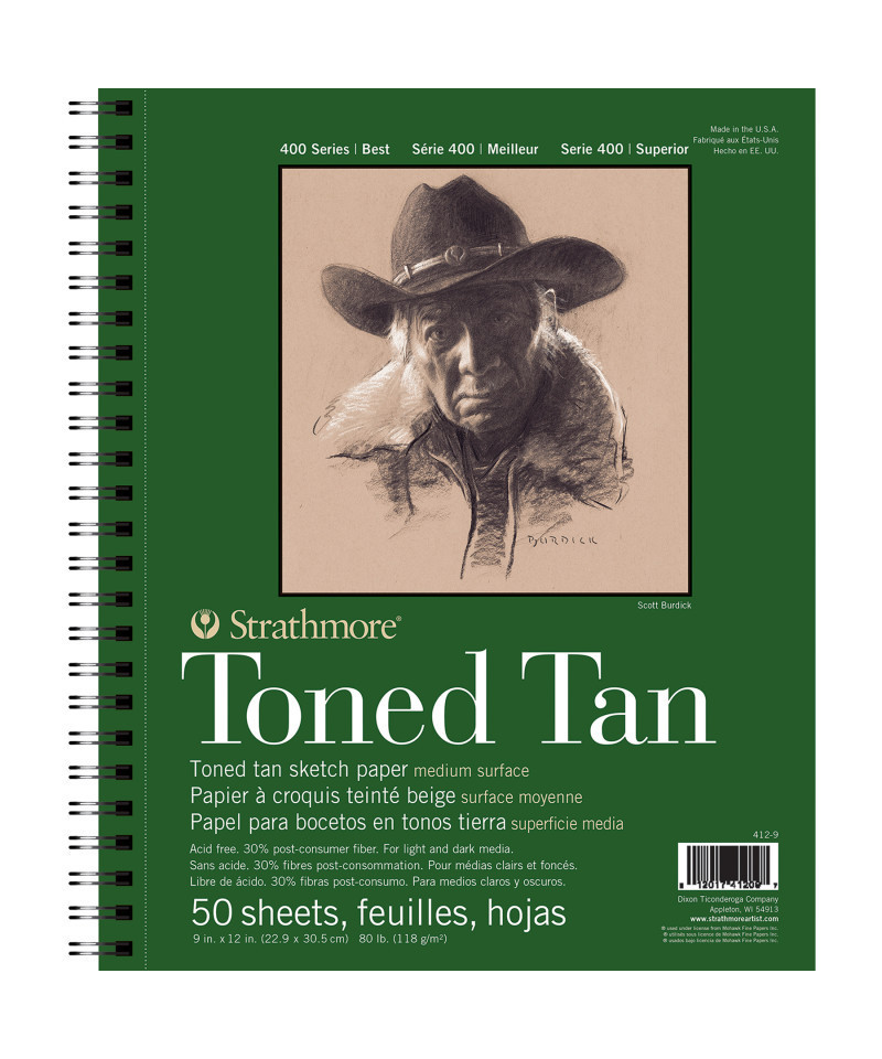 Introducing Strathmore 400 Series Toned Sketch Paper—a professional-level drawing surface made from 100% recycled & 30% post-consumer fiber, as well as kraft & bark fiber inclusions for visual interest. Ideal for light & dark media including graphite, chalk, charcoal, sketching stick, markers, china markers, colored pencils, pens, & white gel pens. The history of Strathmore Paper Company began on St. Patrick's Day in 1892 when its founder, Horace Moses, opened the Mittineague Paper Mill in West Springfield, MA. Strathmore has been a leading supplier of fine art papers for 130 years & founded with the belief that better paper makes better art. Strathmore provides artists of all levels with one of the widest ranges of quality surfaces for producing beautiful works of art, no matter the choice of medium. Listening to the needs of artists & providing inspiration, education, & innovating new products is at the core of what matters to Strathmore. The Strathmore 400 Series, easily recognized by its iconic brown cover, has been a staple in the hands of art students & professional artists. Known for its dependable quality & time-tested durability, this series of art paper provides high school art students, college art students, dedicated hobbyists & career artists a range of surfaces from practice to final pieces. Artists working with watercolor paint, acrylic paint, oil paint, pastel, colored pencil, charcoal, marker, pen, ink & more have a curated pad customized for their needs. Confidently create showcase-worthy pieces for galleries, competitions & online market places with this beloved brand!