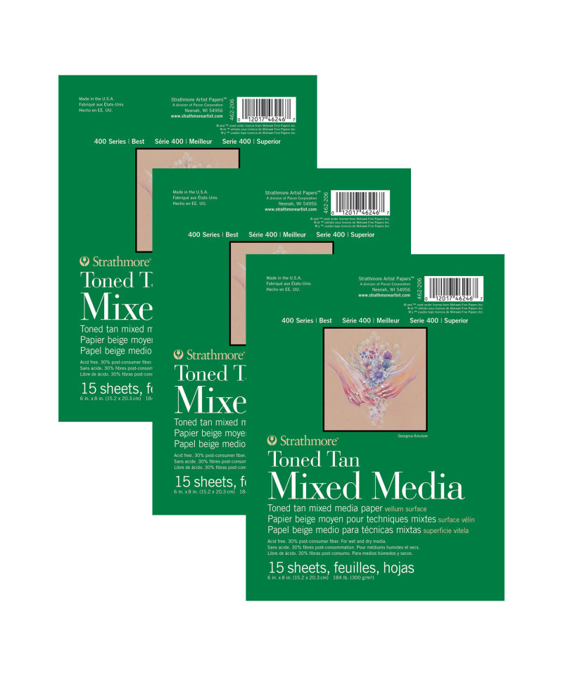Introducing the Strathmore 400 Series Mixed Media Paper—a versatile surface for professional artists, ready to handle whatever your creativity throws at it. By combining the characteristics of watercolor paper with the finish of a drawing sheet, we've created the ultimate paper for artists to confidently explore watercolor washes, ink lines, & layers of pastel or colored pencil without fear of warping or tearing. Freely create richly dynamic pieces that truly stand out. The history of Strathmore Paper Company began on St. Patrick's Day in 1892 when its founder, Horace Moses, opened the Mittineague Paper Mill in West Springfield, MA. Strathmore has been a leading supplier of fine art papers for 130 years & founded with the belief that better paper makes better art. Strathmore provides artists of all levels with one of the widest ranges of quality surfaces for producing beautiful works of art, no matter the choice of medium. Listening to the needs of artists & providing inspiration, education, & innovating new products is at the core of what matters to Strathmore. The Strathmore 400 Series, easily recognized by its iconic brown cover, has been a staple in the hands of art students & professional artists. Known for its dependable quality & time-tested durability, this series of art paper provides high school art students, college art students, dedicated hobbyists & career artists a range of surfaces from practice to final pieces. Artists working with watercolor paint, acrylic paint, oil paint, pastel, colored pencil, charcoal, marker, pen, ink & more have a curated pad customized for their needs. Confidently create showcase-worthy pieces for galleries, competitions & online market places with this beloved brand! Sold as a pack of 3.