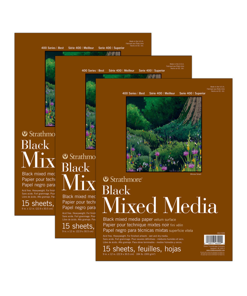 Strathmore 400 Series Mixed Media Pad, Black, Glue Binding, 15 Sheet, 9x12 inch, Pack of 3