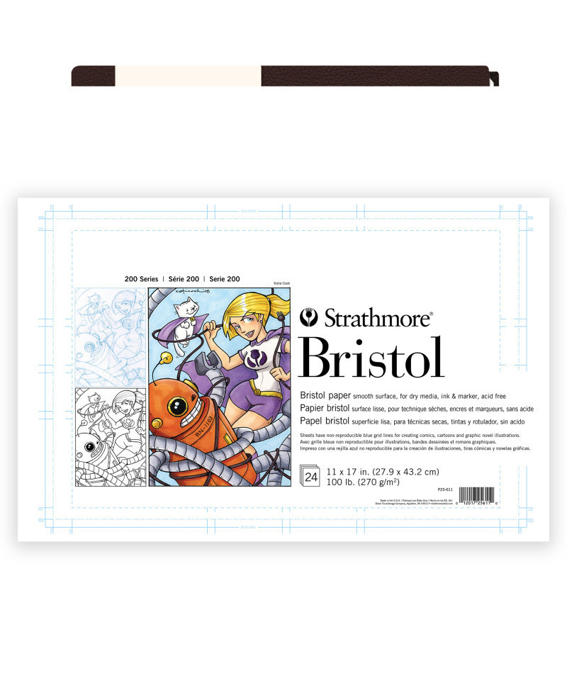 Introducing Strathmore 200 Series Bristol Paper--designed to support young and novice artists as they build confidence in their creative journey from elementary through middle school. Created specifically for the comic, cartoon, and graphic novel industry, the Sequential Art Sheet is printed with non-reproducible blue lines standard within the cartoon, comic & animation community. The smooth surface captures fine lines & details from pen, ink, and marker. Our 200 Series provides budget-friendly art surfaces ideal for worry-free experimentation, encouraging creativity without the stress of wasting expensive materials. Our 200 Series provides budget-friendly art surfaces ideal for worry-free experimentation, encouraging creativity without the stress of wasting expensive materials. Paper is available in standard sheet sizes & safely bound to a protective cover & chipboard backing for easy transportation to and from class. Help your student explore multiple artistic techniques with various paper types, including Bristol, Newsprint, Sketch, Tracing, Watercolor, Mixed Media & more!