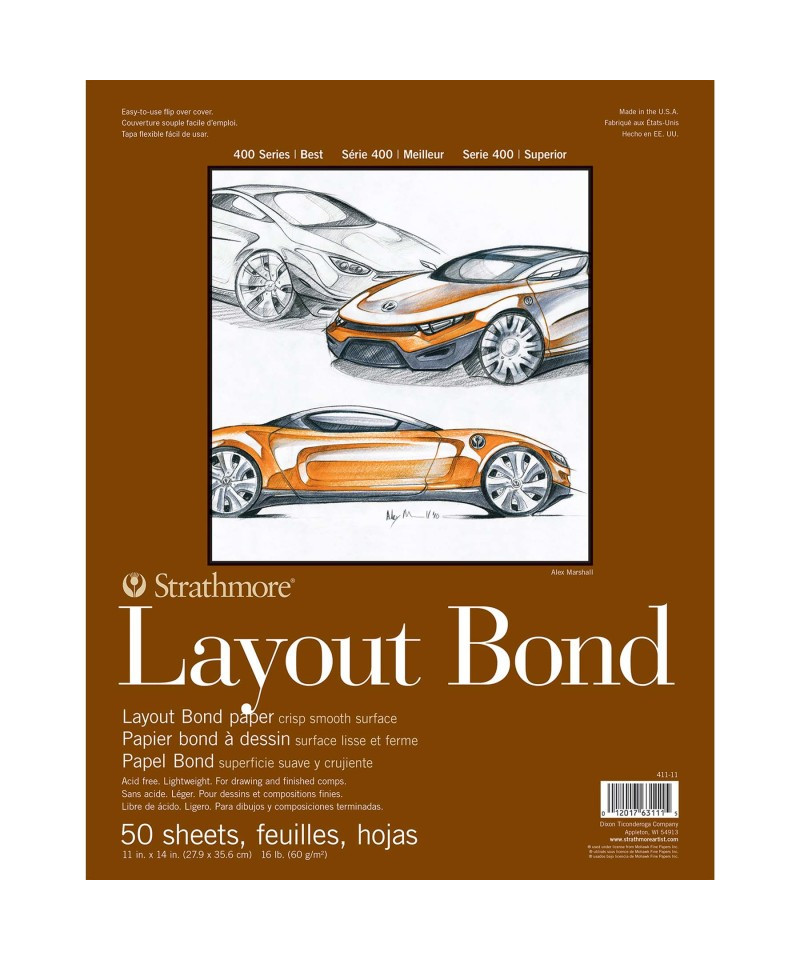 Introducing Strathmore 400 Series Layout Bond Paper--an ideal layout paper for rough drawings or finished compositions, suitable for pencil, pen, and marker; this lightweight, semi-transparent paper is ideal for designing and rendering. Our 400 Series is often easily recognized thanks to the iconic brown cover used across our fine art pads. Known for its dependable quality & time-tested durability, this series is a staple in the hands of art students & professional artists, from their first art class in middle school, through to high school competitions, collegiate course work & on to a career as a professional artist, fashion designer, architect, illustrator, animator or engineer.