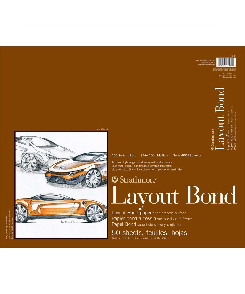 Introducing Strathmore 400 Series Layout Bond Paper--an ideal layout paper for rough drawings or finished compositions, suitable for pencil, pen, and marker; this lightweight, semi-transparent paper is ideal for designing and rendering. Our 400 Series is often easily recognized thanks to the iconic brown cover used across our fine art pads. Known for its dependable quality & time-tested durability, this series is a staple in the hands of art students & professional artists, from their first art class in middle school, through to high school competitions, collegiate course work & on to a career as a professional artist, fashion designer, architect, illustrator, animator or engineer.