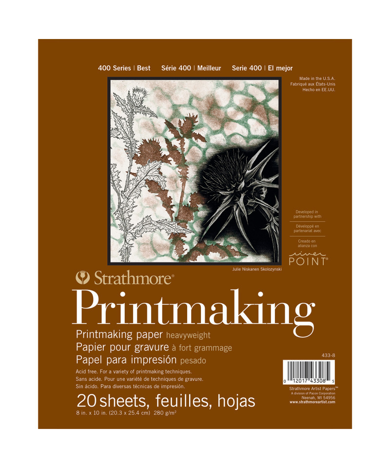 Introducing Strathmore 400 Series Heavyweight Printmaking Paper-- a natural white paper made for relief printing with block or linocut, screen printing, lithography, intaglio, practicing, and proofing. This paper utilizes medium-textured surface that is both soft and durable to absorb large amounts of ink. Contains high levels of alpha cellulose wood fiber to improve absorption while making your images pop. Our 400 Series is often easily recognized thanks to the iconic brown cover used across our fine art pads.
