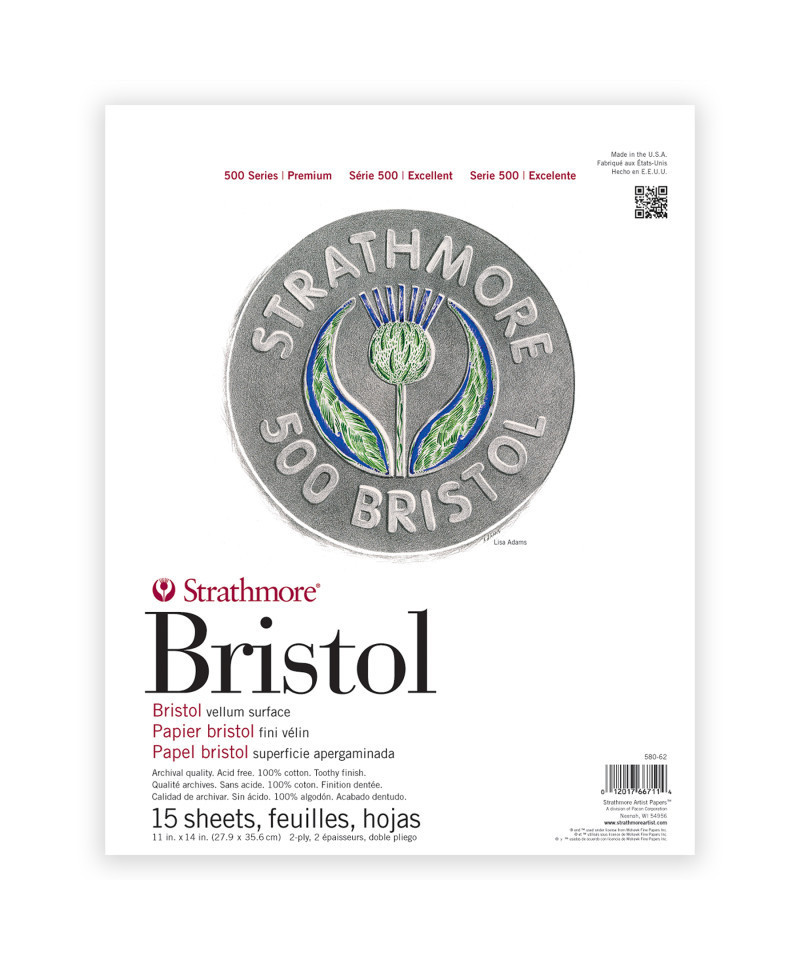 Introducing Strathmore 500 Series Bristol Paper-- a 2-Ply Plate Surface Bristol surface with an ultra-smooth finish surface perfect for comics, cartoons, and graphic novel. A popular choice among illustrators & drawing artists because of a stiffer, museum quality surface that is ready to display without additional mounting. The term Bristol derives from the early days of European papermaking when mills would send their finest papers to Bristol, England to be pasted together to form heavyweight drawing sheets. Our Bristol Paper is available in two finishes: Plate has an ultra-smooth finish that is unsurpassed for detailed work with technical pen, airbrush and marker; Vellum has a toothy finish that is excellent for pencil, charcoal, pastel and oil pastel as well as pen, airbrush, and light washes. Our 500 Series sets the standard for excellence within the fine art industry, featuring superior-grade surfaces crafted with 100% cotton fibers for unmatched durability, carefully crafted textures & archival, acid-free composition. Endorsed by professional artists as the surface of choice for art pieces showcased in galleries, sold at auctions or submitted to the most prestigious competitions.