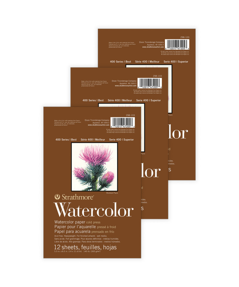 Introducing Strathmore 400 Series Watercolor Paper—a cold press sheet offering just the right amount of texture to bring depth & character to every brushstroke. Its absorbent surface beautifully captures vibrant colors while allowing for smooth blends & soft transitions, making your watercolors come to life. This versatile paper is perfect for everything from delicate washes to bold, expressive techniques, perfect for professional watercolor artists. Our 400 Series is often easily recognized thanks to the iconic brown cover used across our fine art pads. Known for its dependable quality & time-tested durability, this series is a staple in the hands of art students & professional artists, from their first art class in middle school, through to high school competitions, collegiate course work & on to a career as a professional artist, fashion designer, architect, illustrator, animator or engineer. Artists working with watercolor paint, acrylic paint, oil paint, pastel, colored pencil, charcoal, marker, pen, ink & more have a curated paper customized for their needs. Confidently create showcase-worthy pieces for galleries, competitions & online market places with this beloved series! Sold as a pack of 3.