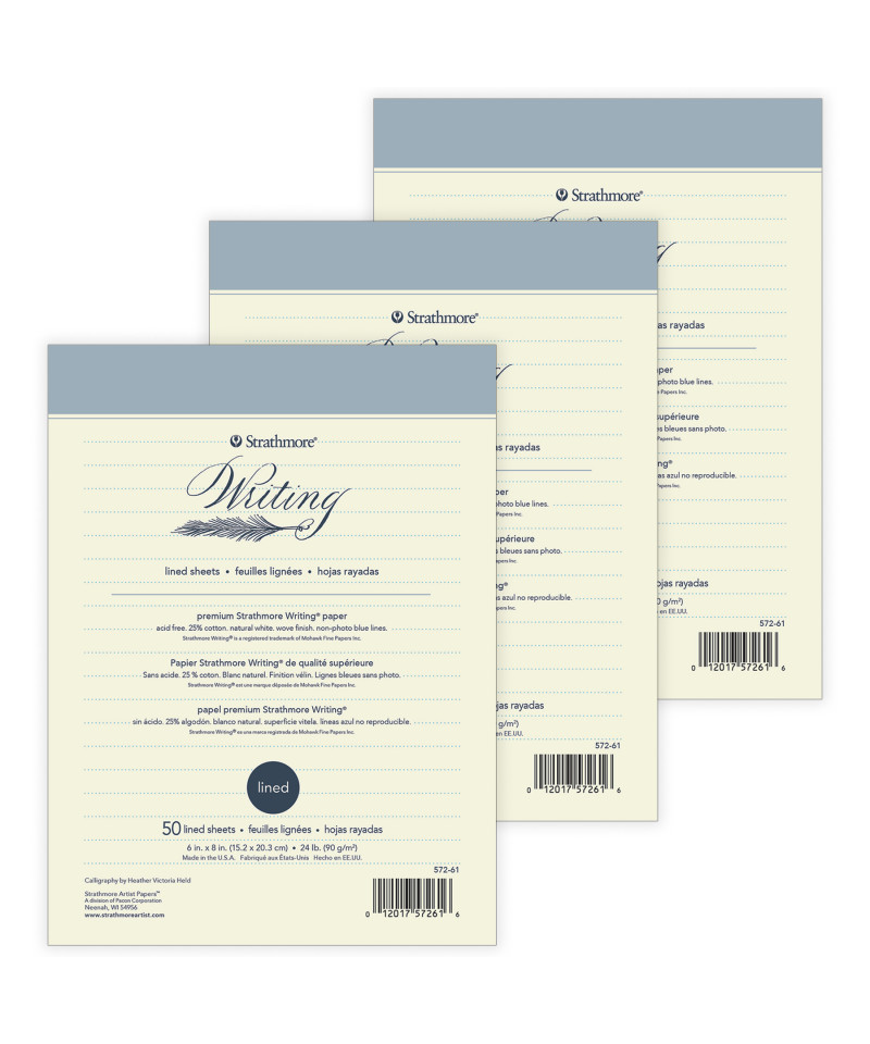 Introducing Strathmore 500 Series Lined Writing Paper--the perfect writing companion for calligraphers, hand lettering hobbyists, and anyone desiring to create artful correspondence. With a natural white, wove finish paper that is both acid free and non-photo blue lined, let your writing command the page in an organized fashion. The 25% cotton paper is ideal for a broad range of ink and pencil writing instruments. Pads feature a flip-over cover that for an easy, clean sheet removal without the risk of tears or creases. Our 500 Series sets the standard for excellence within the fine art industry, featuring superior-grade surfaces crafted with 100% cotton fibers for unmatched durability, carefully crafted textures & archival, acid-free composition. Endorsed by professional artists as the surface of choice for art pieces showcased in galleries, sold at auctions or submitted to the most prestigious competitions. Sold as a pack of 3.