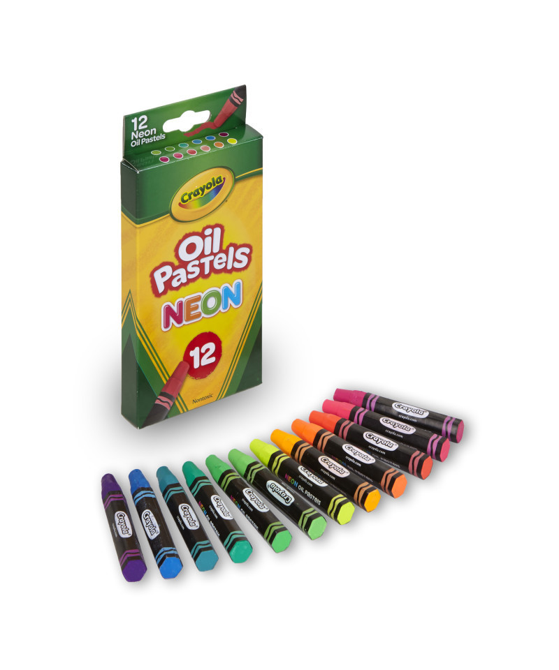 Lay down bright neon colors that are easy to mix with Crayola Neon Oil Pastels. These jumbo-sized sticks are designed for kids with a hexagon shape that prevents them from rolling off desks. The tapered points are ideal for detailed drawing. Includes 12 sticks in hot magenta, shocking pink, radical red, outrageous orange, neon carrot, laser lemon, electric lime, screamin' green, graphic green, aqua brite, blue bolt, vivid violet. For 4 years and up.