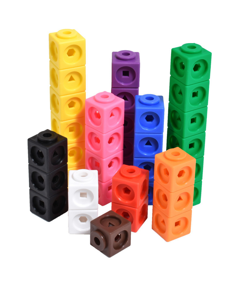 This set of 100 linking math cubes includes 10 different colors. Cubes link together on all sides and feature five different geometric shapes on five of the sides: circle, square, triangle, pentagon and hexagon. These cubes are an ideal STEAM resource for every classroom learning environment. They connect with an easy, soft click, making them appropriate for children aged 3+. The set of 100 math cubes comes with an Activity Guide, which provides inspiration and ideas for using the cubes as an early math manipulative. Perform problem solving and reasoning tasks by color only or by shape and color for more advanced/older users. Size: 0.75" sides.