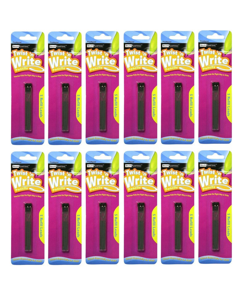 The Twist 'N Write Pencil is specially designed to fit smaller hands and make writing easier. Kids get excited about the Twist 'N Write because it puts the fun back into writing. The pen's wishbone shaped body naturally shapes the fingers into the school-taught "tripod" finger grasp. Whether your kids are doodling or practicing longhand, the soft rubber body and curvy shape are built for comfort and helps them focus on their content without worrying about their pencil grip or their writing speed. The thick 2mm pencil lead never needs sharpening. Just twist the tip to expose more lead. When the lead runs out, simply pop in a fresh one and this pencil will just keep on giving. Each PenAgain Twist 'N Write Pencil refill pack contains 5 spare pencil leads so your kids can keep on writing. Helpful for Arthritis and Ehlers Danlos Syndrome patients. Each pack includes 5 refills. Sold as 12 packs for a total of 60 lead refills.