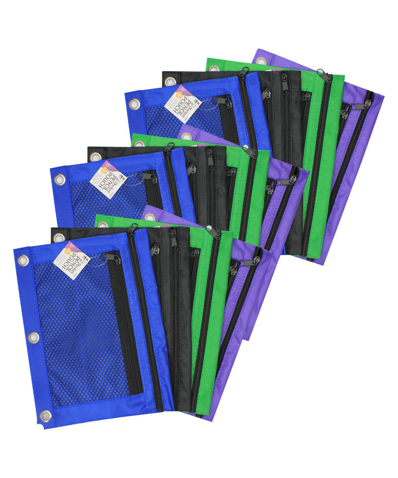 Double pocket pencil pouch, has a mesh front for easy viewing. Fits easily into a 3 ring binder and has reinforced grommet holes. Durable construction for long lasting use. Sold in assorted colors: black, blue, purple and green (no color choice). Pack of 12 pencil pouches.