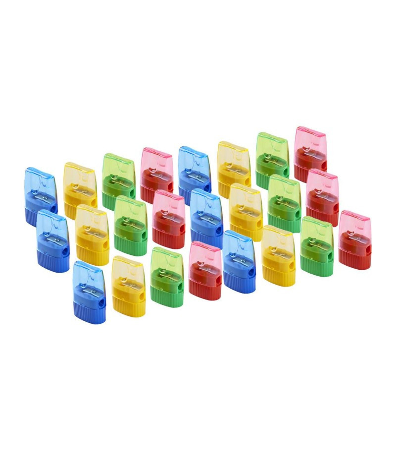 Sharpener boasts a sturdy plastic construction with a steel blade, that sharpens standard pencils cleanly and effectively. Sharpener also features a cone receptacle for pencil shavings. Sold as a pack of 24 in assorted colors (no color choice).