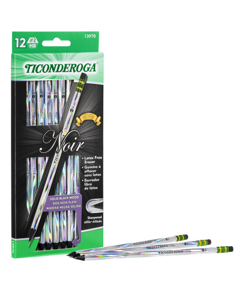 Ticonderoga® Noir Pencils lend a new look to our classic #2 pencil. Finished with an elegant holographic design that looks like crystal, Ticonderoga Noirs are made from premium stained black wood that will remain black when sharpened. These pencils are more than pretty. Our exclusive graphite core formula makes them great performers. High-quality, black, latex-free erasers result in smudge-free corrections. PMA certified non-toxic. Each pack includes 12 pencils.