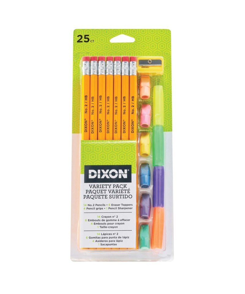With the Dixon line of pencils, you never have to sacrifice quality for price. Cased in 100% first-rate commercial grade wood, this economical line of pencils is perfect for use in schools, homes and businesses. Dixon quality pencils feature quality graphite cores and long lasting, non-latex erasers. Set includes 12 pencils, 6 eraser toppers, sharpener, and 4 pencil grips in assorted colors. You won’t find better value in an economy pencil. PMA certified non-toxic.