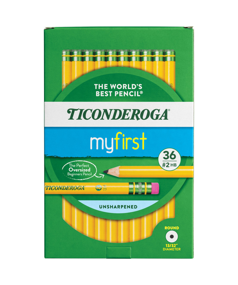 Ticonderoga My First Pencils have a large size diameter (13/32") which is ideal for children in the early stages of their writing development. The exclusive #2 graphite formula provides extra smooth performance. These pencils are made with premium wood from responsibly managed forest. The pencils are PMA Certified and non-toxic. The erasers are latex-free and erase cleanly without leaving smudges or tearing the paper. Each pack includes 36 pencils with erasers.