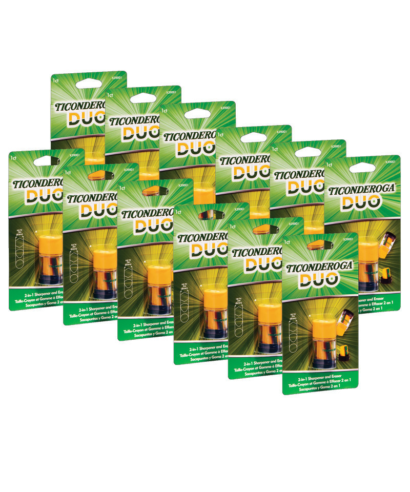 Ticonderoga® Duo is twice as practical. The Ticonderoga® 2 in 1 pencil sharpener is ideal for sharpening pencils and crayons in any shape up to 8 mm in diameter. The Duo also has a handy eraser and sharpening container. All you need, whenever you need it. Sold as a pack of 12.