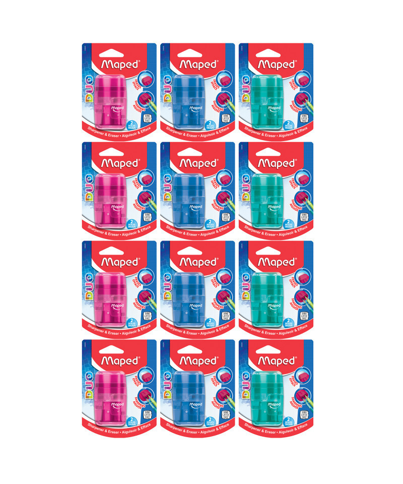The Maped Connect DUO 2 Hole Sharpener & Eraser easily separates into two pieces - mix and match the colors to create your own! Remove the top cover to find a super-soft eraser, and flip open the bottom cap to access the 2 hole pencil sharpener for standard & jumbo sized pencils! With a body made of shatter-resistant, transparent plastic it's always each to tell when you need to empty the shavings canister. Eraser is Latex, PVC & Phthalate free. Sold as a pack of 12 in assorted colors: Blue, Green and Pink (no color choice).