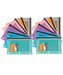 Measures 9.8" x 7". Made of durable 600D polyester - scratch resist. Features reinforced 3 ring holed on bags to place in binders. Safe and non-toxic. Features a quality zipper closure for easy access, and to secure your items. One compartment with mesh window allows to see through and find things easily. Ideal for organizing small items like pens, pencils, crayons, markers, whiteout, highlighter, business card, checks, receipt, flash cards, charging cords, USB cables and more. Great gift for young kids for organizing. Keep everything in their own bag so they won't miss anything. Fun, colorful, and elegant. Perfect for teachers, students, adults, teens, and children. Sold as a pack of 12 pouches in 6 pastel colors (no color choice).