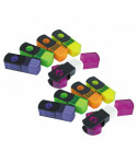 Keep your pencils sharp and erase any marks all in one! Durable eraser on one end. Flip the canister to reveal single-hole sharpener. German steel blades cleanly and easily sharpen pencils. Sold as a pack of 10 sharpeners in assorted colors (no color choice).