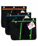 Triple pocket pencil pouch features a mesh front for easy viewing. Fits easily into a 3 ring binder and has reinforced grommet holes. Main pocket expands outward to 1 inch for extra storage. Durable construction for long lasting use. Pack of 3 includes 1 each of Green, Orange and Blue accents.