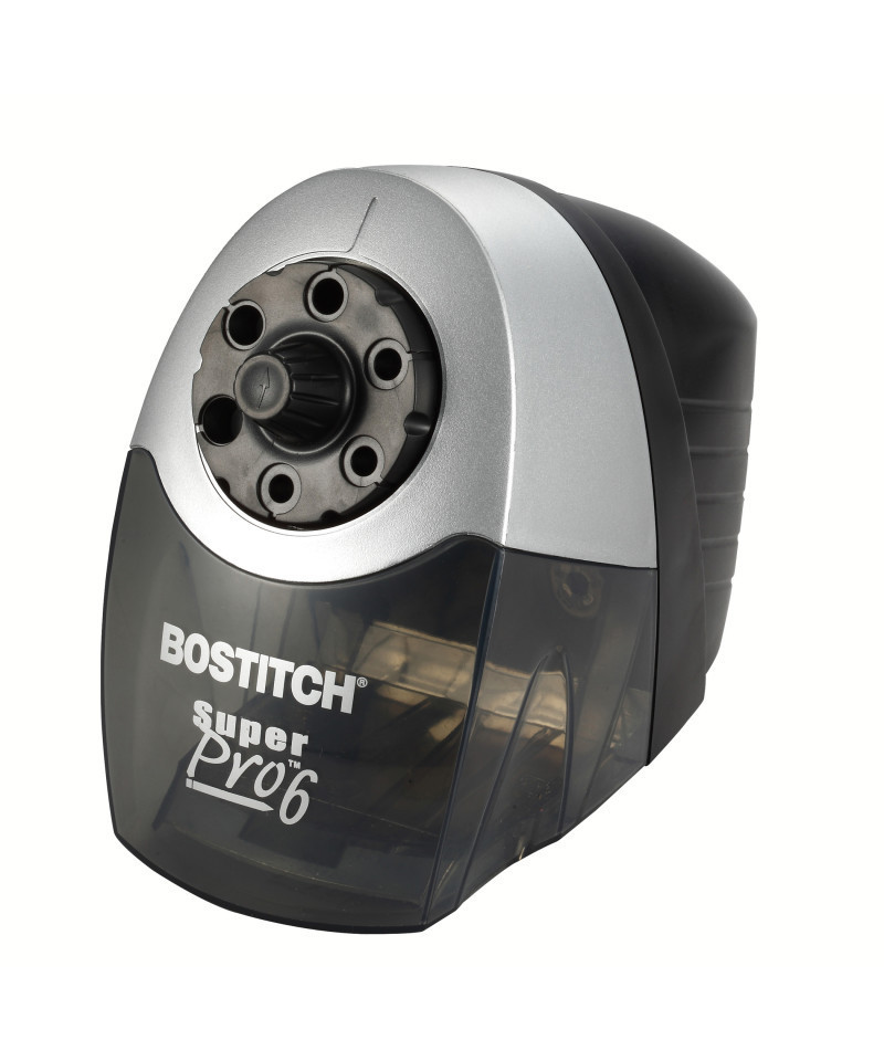The Super Pro 6™ heavy duty electric pencil sharpener is the mother of all pencil sharpeners. From function to form, each element was engineered for high use commercial environments. At the heart of the sharpener is an extreme QuietSharp™ motor for heavy duty use. The motor is fan-cooled so it won't overheat and shut down. A thermal overload protection also ensures stall-free performance. For super fast sharpening, the XHC²™ Cutter Technology is 75% faster with 12x longer life. The Tip Saver Technology™ prevents over sharpening, extending pencil life. A MagnaSafe™ tamper proof switch activates when the shavings tray is removed. This prevents operation for safety during cleaning. On the front of this heavy duty pencil sharpener you'll find the easy spin, 6-size pencil selector dial. This dial supports many pencil sizes, from standard to jumbo models! An oversized die cast metal base and added suction cup feet provide the utmost stability. This sharpener can handle the toughest jobs you through at it!