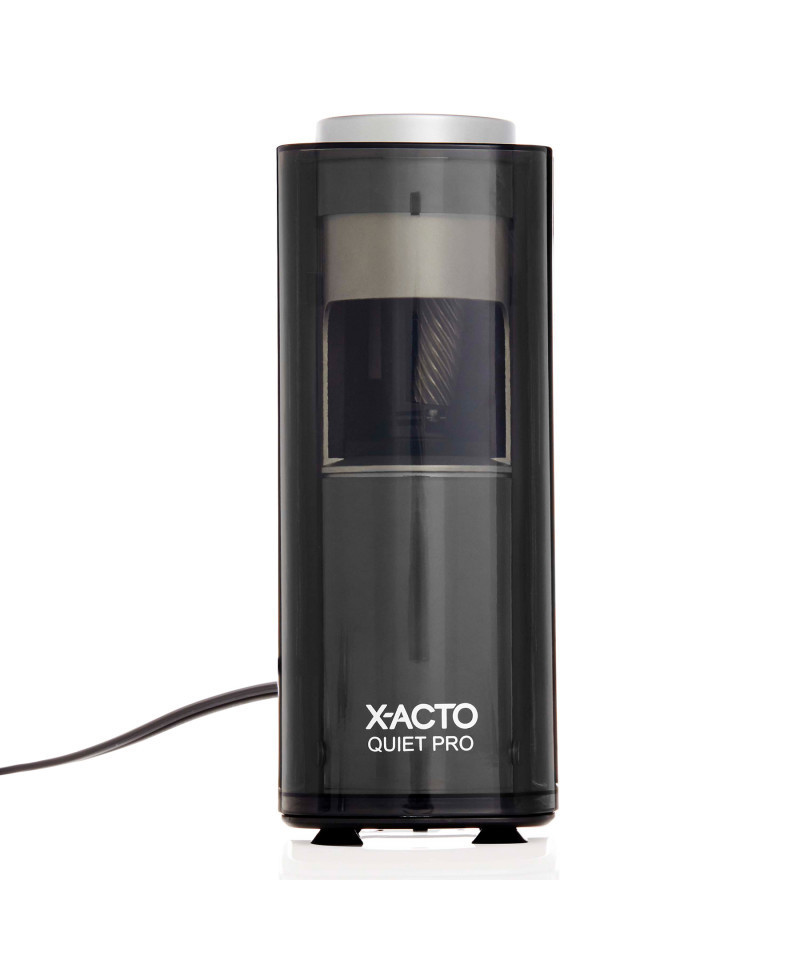 Ultra quiet and break resistant, the X-ACTO Quiet Pro Electric Pencil Sharpener provides less breakage and less noise for less frustrations and distractions. With the SmartStop feature, the pencil sharpener prevents over-sharpening by automatically shutting off the electric motor when the pencil reaches ideal sharpness. Meanwhile, a bold LED light lets you know when the sharpening is complete. The auto-adjust dial works with nearly all pencil sizes while the slip-resistant bottom keeps the pencil sharpener steady. Finally, the SafeStart electric motor stops when the extra-large, easy-to-empty shavings bin is removed. It's also compatible with colored pencils. Stay sharp with X-ACTO, the #1 electric pencil sharpener brand!