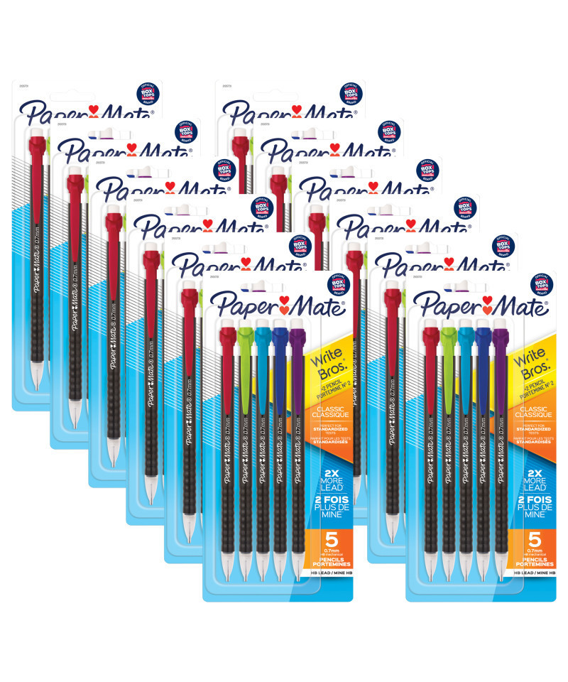With 50% more lead*, Paper Mate Write Bros. Classic Mechanical Pencils help you spend more time writing and less time at the pencil sharpener. Meanwhile, a smudge-free eraser keeps your writing clean. Finally, the #2 pencil lead (0.7mm) makes these mechanical pencils ideal for standardized testing. They're great for fast-paced home, office, and school use! Each pack includes 5 pencils. Sold as 12 packs for a total of 60 pencils.