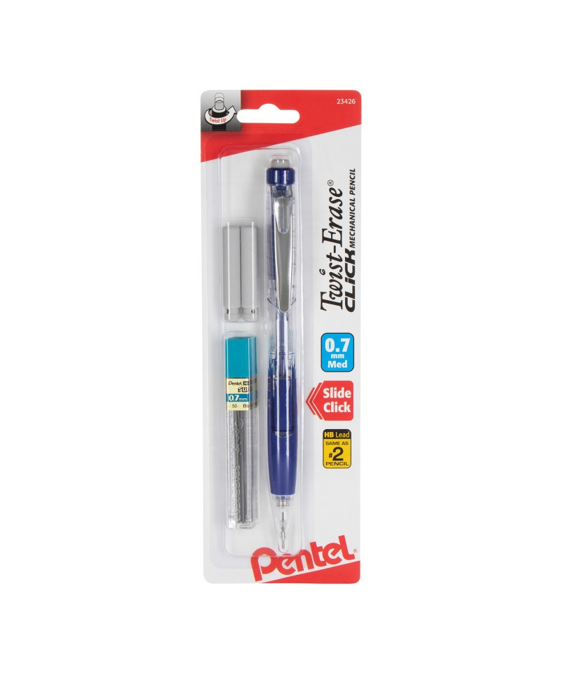 Twist-Erase® Click features clear barrels with color accents. Quick-click side button advances lead. Pre-loaded with Super Hi-Polymer® HB 0.7mm lead. Quick-click side button advances lead without interrupting your writing. Clear barrels with color accents for a stylish twist on pencils. Mistakes are no match for the larger than ordinary and long lasting twist-up eraser. Extended comfort grip (also latex-free), perfect no matter how you hold your pencil. Includes 1 pencil in assorted colors (no color choice) with lead and 2 erasers.