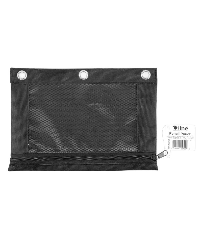 Durable polyester pencil pouch with single zipper compartment. Features black mesh reinforced window for easy viewing. Store pencils, crayons, erasers, markers and other small supplies. 3-hole punched to fit in binders. Zipper keeps contents secure. Measures 7" x 10". Black.