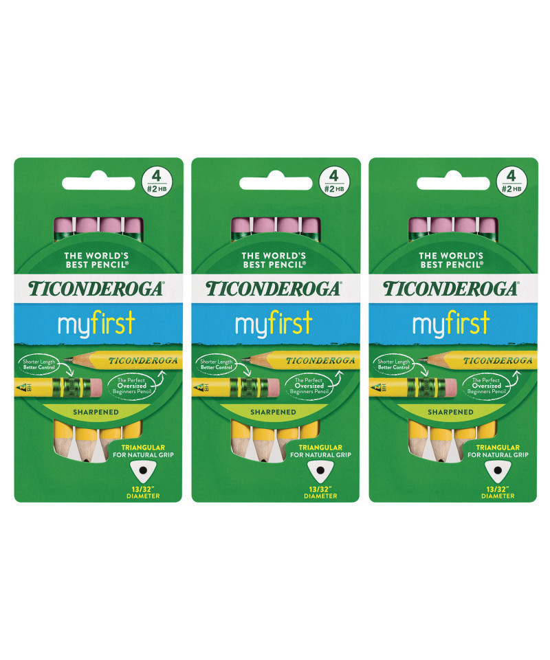 Ticonderoga® My First® short length (4.5") pencils deliver better control and promote a more natural grip as recognized essential by experts in early learning handwriting. The large diameter (13/32") reduces writing fatigue and the triangular shape promotes the correct 3 finger grip. Premium wood harvested from responsibly managed sources provides smooth, even sharpening with minimal breakage. Teachers prefer Ticonderoga® brand for its dependability and craftmanship. All Ticonderoga® pencils are PMA certified so you can use them with confidence. Each pack includes 4 pencils. Sold as 3 packs for a total of 12 pencils.