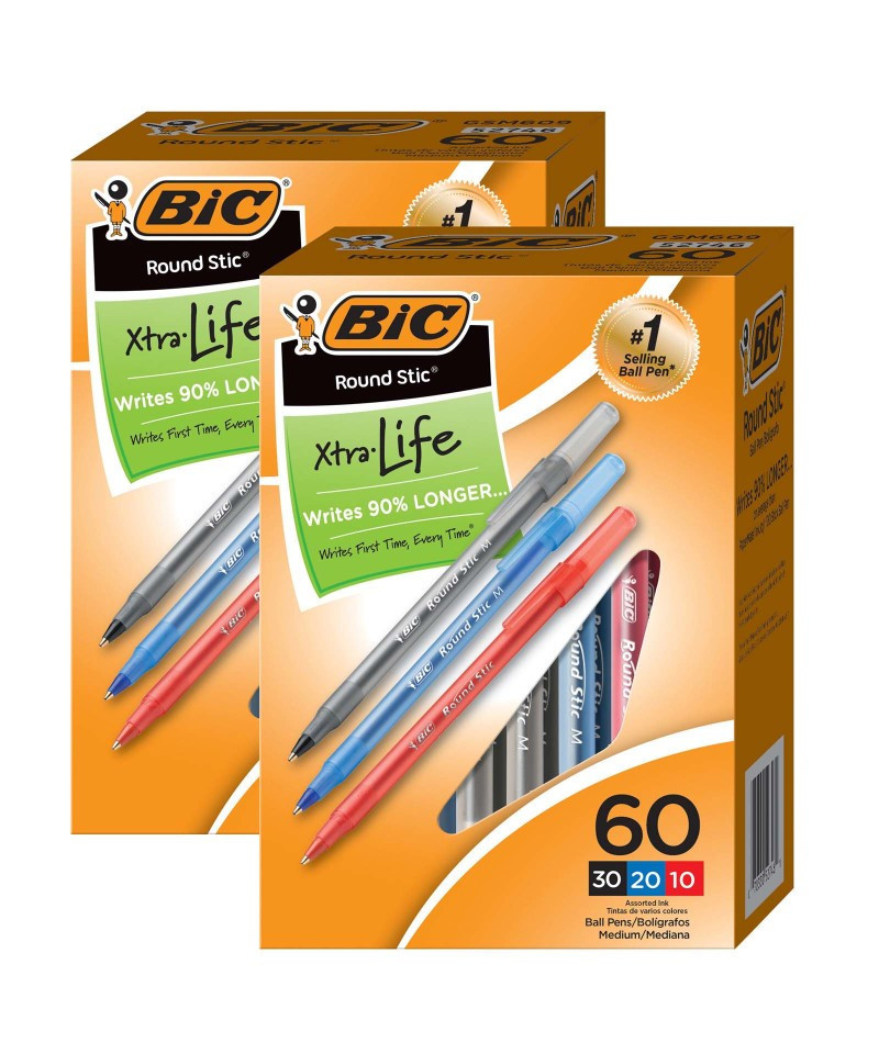 The BIC Round Stic Xtra Life Ball Pen comes with a versatile 1.0mm medium point that creates vivid lines, making it suitable for a wide variety of writing activities. These reliable pens feature a durable tungsten carbide ball point that releases ink consistently and evenly. The translucent barrel lets you see the remaining ink supply, while the flexible round barrel design keeps you comfortable during extended writing sessions. The Round Stic Xtra Life Ball Pen features a flexible round barrel that fits snugly in the hand for hours of comfortable writing. The frosted cap and translucent barrel give the pen a sleek look and keep the ink supply visible, so you can see at a glance how much ink is remaining. Each box includes 60 pens: 30 Black, 20 Blue, and 10 Red. Sold as 2 boxes for a total of 120 pens.