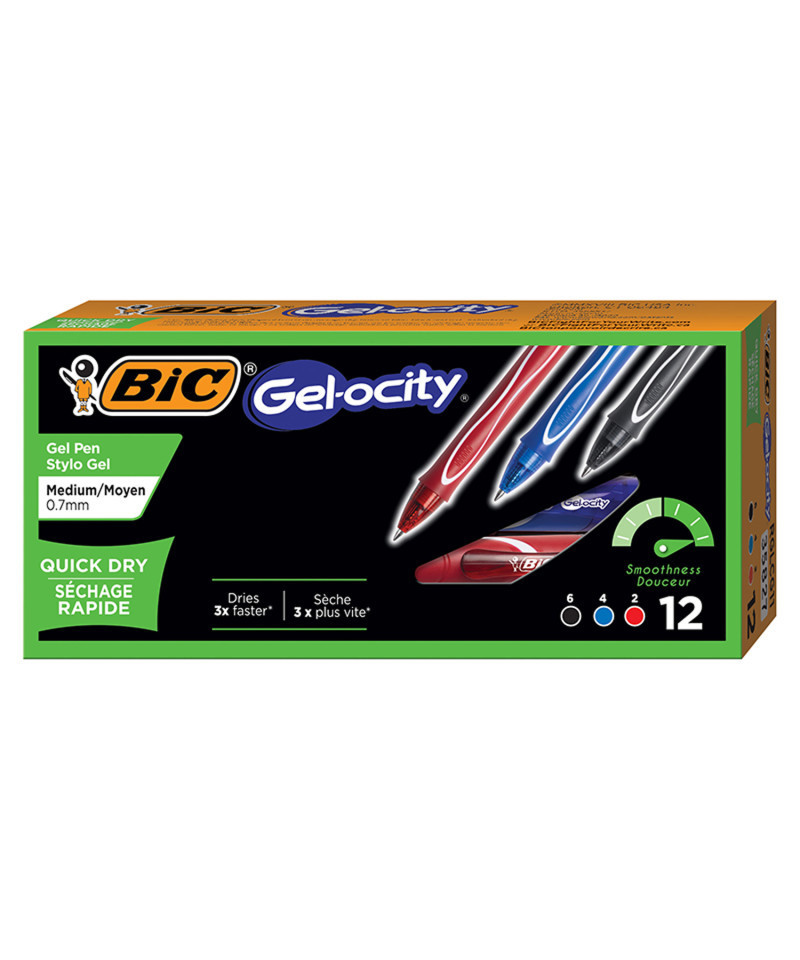Gel-ocity® Quick Dry Retractable Gel dries up to 3x faster for less smearing vs. BIC® Gel-ocity® Original based on average dry times of blue, black and red. Individual dry times may vary by color. Provides a super smooth writing experience. This pen has a comfortable full grip barrel and comes in vibrant, fun colors. Pens are 0.7 mm medium point. Pack includes 12 pens: 6 Black, 4 Blue, and 2 Red.