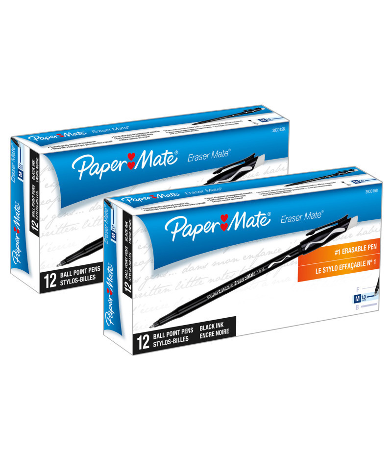 Ink is pressurized, allowing you to write at any angle for complete versatility. Technology advanced erasable ink allows you to write like a ballpoint pen, yet fix mistakes like a pencil. Produces clean, smooth writing on just about any type of surface. Special Ink Type: Erasable; Pen Style: Stick; Ink Color(s): Black; Pen Type: Ballpoint. Sold as 2 dozen pens.